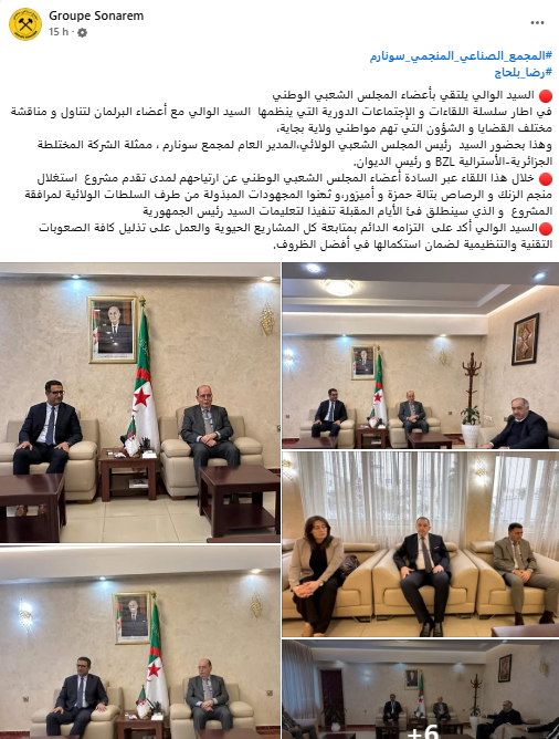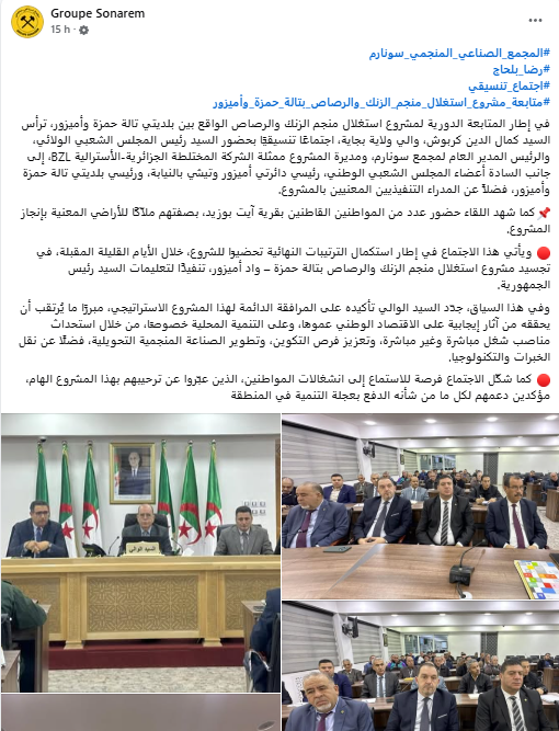 وترأس الاجتماع والي ولاية بجاية كمال الدين كربوش بحضور رئيس المجلس الشعبي الولائي، والرئيس المدير العام للمجمع الصناعي المنجمي سونارم رضا بلحاج، ومديرة المشروع ممثلة الشركة المختلطة الجزائرية-الأسترالية BZL، إلى جانب أعضاء المجلس الشعبي الوطني، ورئيسي دائرتي أميزور وتيشي بالنيابة، ورئيسي بلديتي تالة حمزة وأميزور، فضلاً عن المدراء التنفيذيين المعنيين بالمشروع.