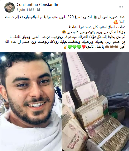 حظي شاب فقير من ولاية أم البواقي، بإشادة واسعة عبر مواقع التواصل الاجتماعي، بعد أن عثر على مبلغ 320 مليون سنتيم وأعاده لصاحبه.
