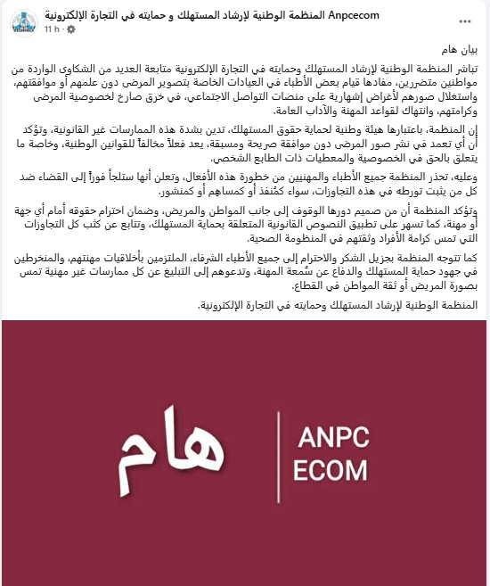 أعلنت المنظمة الوطنية لإرشاد المستهلك وحمايته في التجارة الإلكترونية “Anpcecom” مباشرتها متابعة العديد من الشكاوى التي وردت من مواطنين متضررين من قيام بعض الأطباء في عيادات خاصة بتصوير مرضى دون علمهم أو موافقتهم، واستغلال صورهم في حملات إشهارية على منصات التواصل الاجتماعي.
