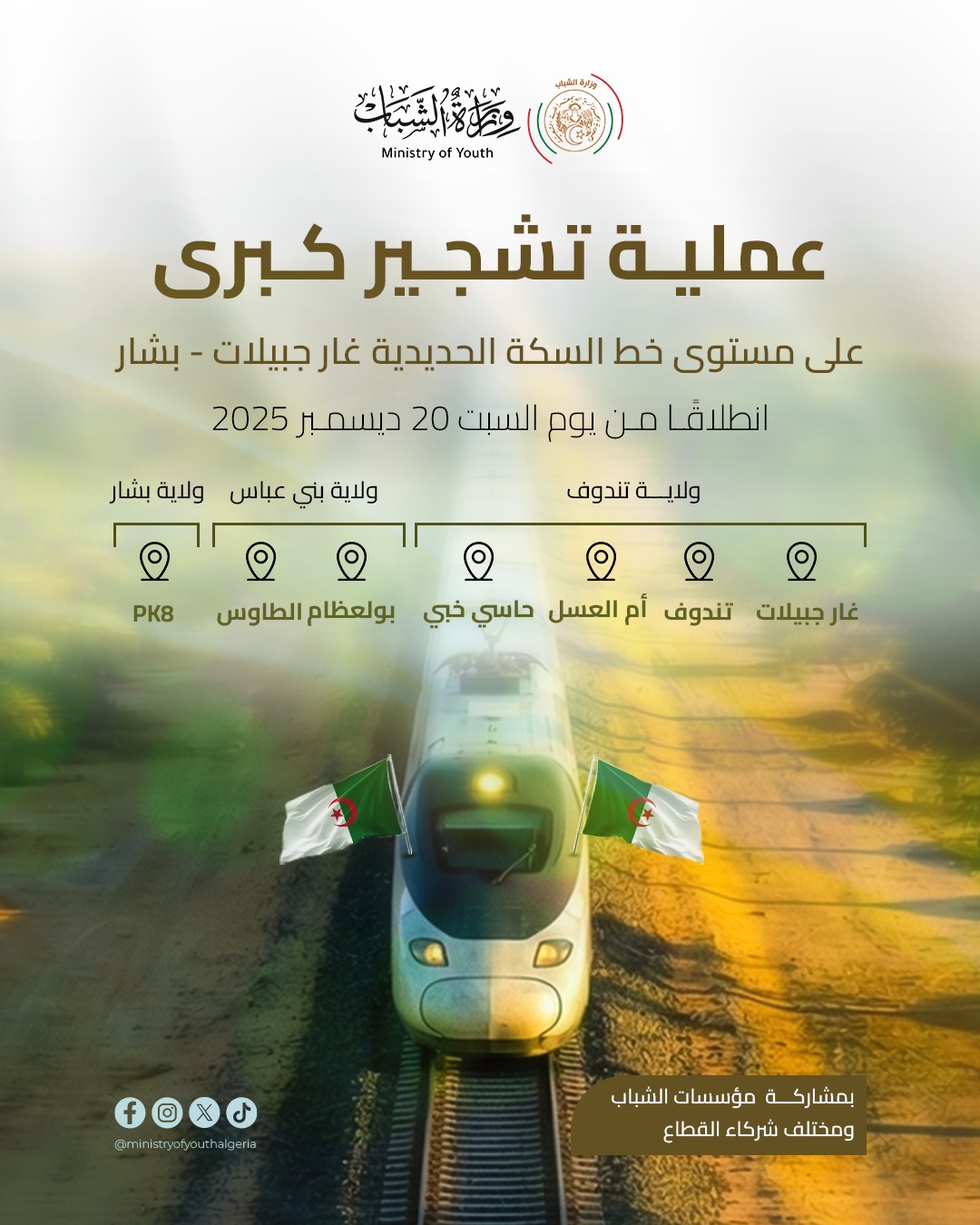 أعلنت وزارة الشباب إطلاق عملية تشجير كبرى على مستوى خط السكة الحديدية غارا جبيلات (تندوف) – بني عباس – بشار، في إطار مرافقة المشاريع الاستراتيجية للدولة وتعزيز الممارسات البيئية المستدامة، باعتبار هذا الخط من أهم المشاريع الهيكلية ذات البعد الاقتصادي والوطني.