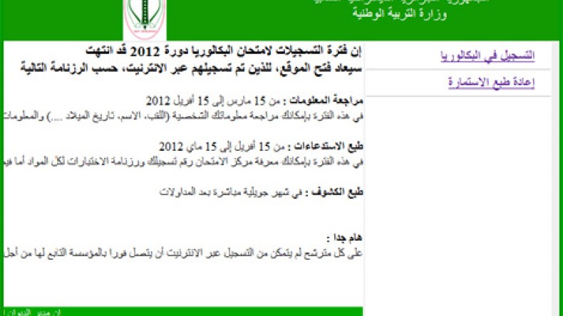 أفاد الديوان الوطني للامتحانات والمسابقات كافة المترشحين الأحرار لامتحان شهادة البكالوريا دورة 2012، أنه سيتم في مرحلة أولى إعادة فتح الموقعين الإليكترونيينinsbac.onec.dz : http أو www.onec.dz/bac ابتداء من 15 مارس إلى غاية 10 أفريل 2012 لتمكين المترشحين من تأكيد معلوماتهم، خاصة ما تعلق بالإسم واللقب وتاريخ ومكان الميلاد، وكذا الإعفاء والكفاءة في التربية البدنية.