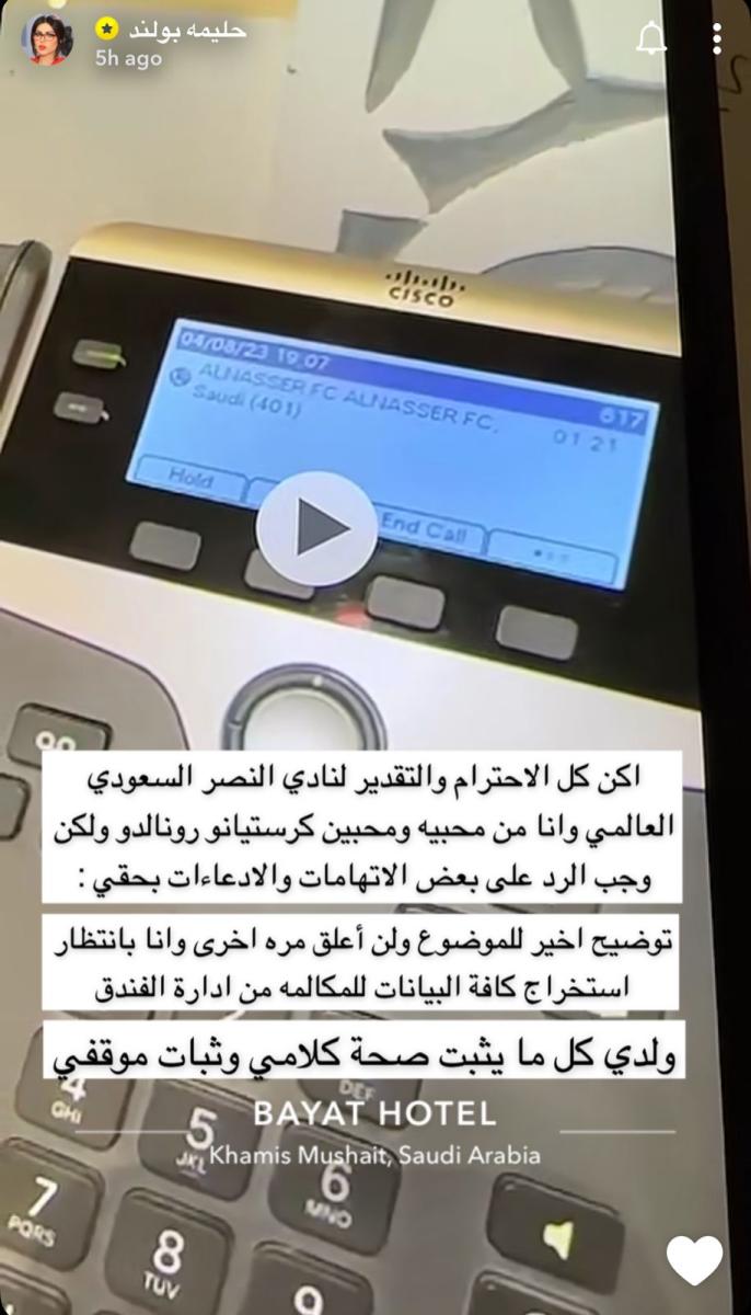 ورفضت إدارة نادي النصر السعودي التعليق على فيديو اتصال نجم الكرة كريستيانو رونالدو، بالإعلامية الكويتية حليمة بولند، والذي اتضح حسب قولهم أنه “مفبرك”