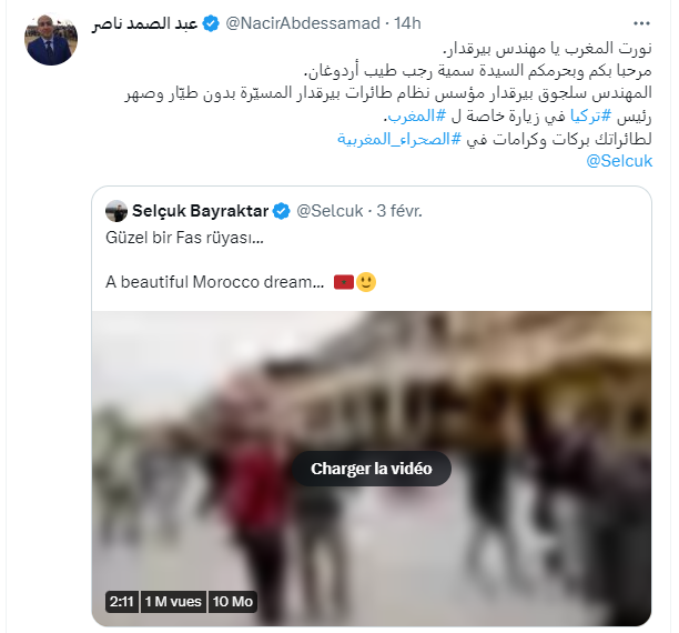 وعلق ناصر على زيارة المهندس سلجوق بيرقدار مؤسس نظام الطائرات بدون طيار التركية إلى المغرب، بتغريدة “غريبة” ضمنها عبارات تمجيد، لقتل المدنيين من تجار ومنقبين عن الذهب على حدود الصحراء الغربية، من قبل قوات الجيش المغربي.