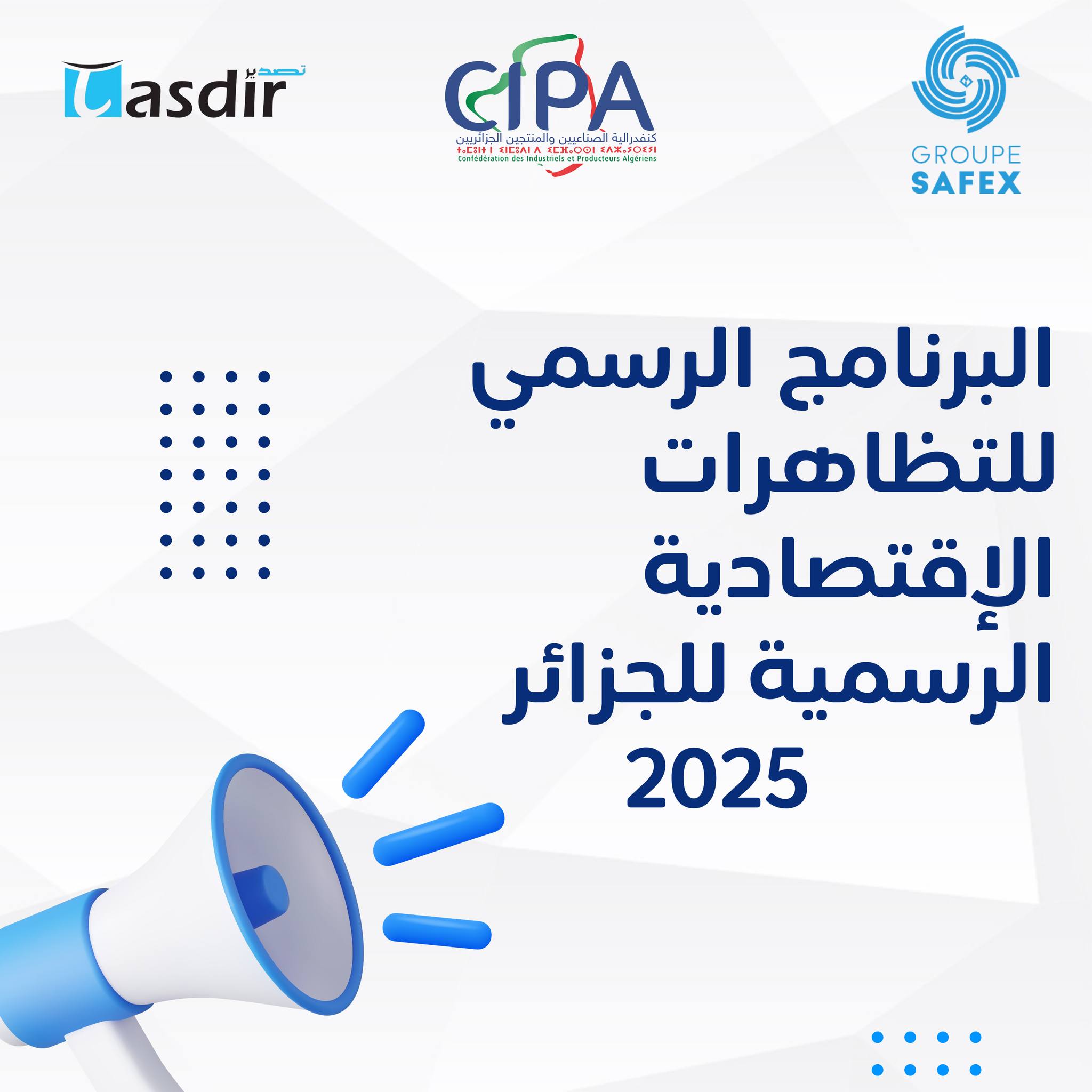 أعلنت الكنفدرالية الجزائرية للصناعيين والمنتجين (CIPA)، الخميس، عن انطلاق البرنامج الرسمي للمشاركة الجزائرية في التظاهرات الاقتصادية الدولية لسنة 2025، وذلك في إطار دعم الصادرات الوطنية وتعزيز حضور المنتوج الجزائري في الأسواق الخارجية.