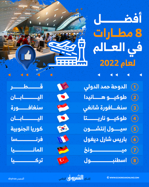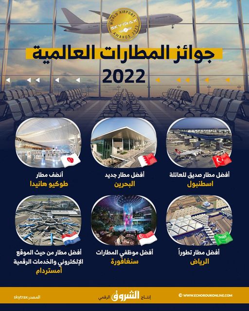 مطار حمد الدولي بالعاصمة القطرية الدوحة يفوز بجائزة أفضل مطارات العالم للعام الثاني على التوالي وفقا لتصويت “سكاي تراكس” (Skytrax).. المطار حاز عدة جوائز مرموقة من بينها: أفضل مطار بالشرق الأوسط، وأفضل مطار لفئة 25 إلى 35 مليون مسافر، وأفضل خدمة موظفين في الشرق الأوسط، وجائزة التميز للمطارات في مواجهة “كورونا”…في المركز الثاني حلمطار هانيدا باليابان متبوعا بمطار شانغي في سنغافورة … أما مطار اسطنبول فحل في المركز الثامن بعد كل من باريس وميونيخ..