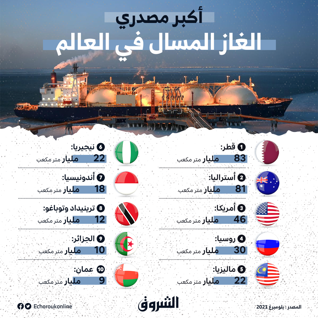تتواجد الجزائر في المركز التاسع عالمياً ضمن قائمة أكبر 10 دول مُصدرة للغاز المسال، بإجمالي 10 مليار متر مكعب.
