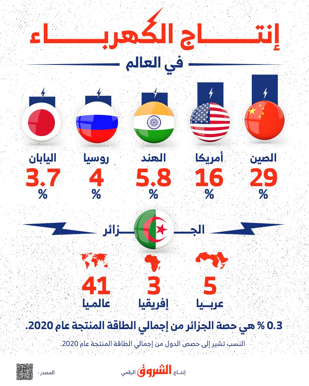 حلت الجزائر في عام 2020 في المرتبة 41 عالميا والثالثة إفريقيا في كمية إنتاج الكهرباء، بنسبة 0.3 بالمائة من الإنتاج العالمي.