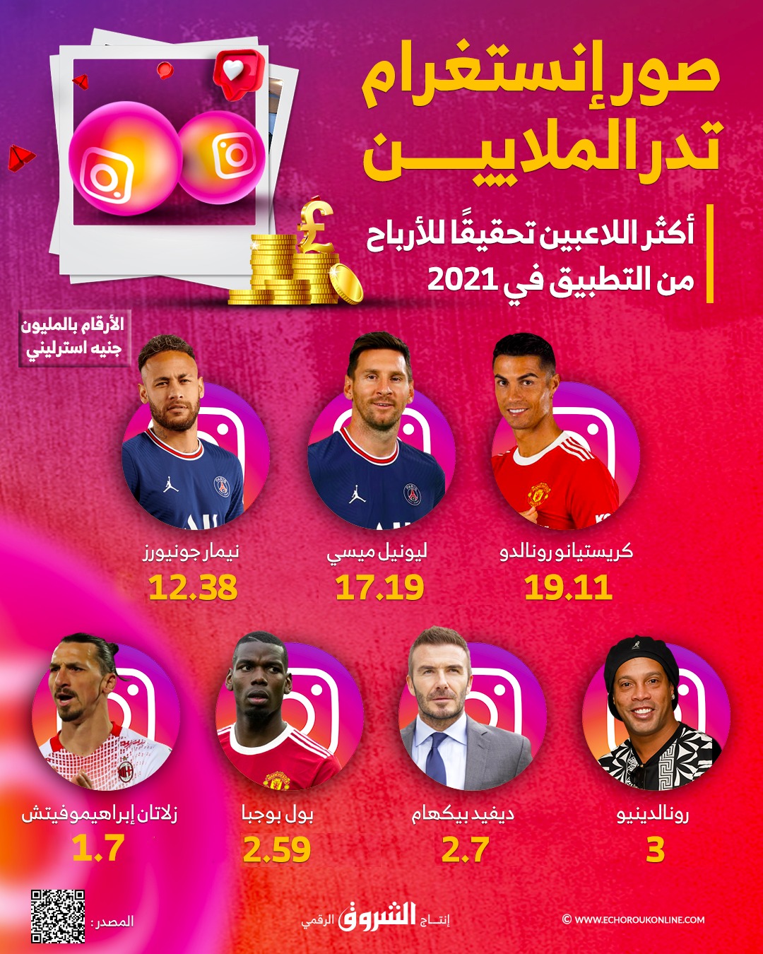 أصبح تطبيق إنستغرام أحد أهم مصادر الأرباح لدى المشاهير واللاعبين الكبار في مختلف أنحاء العالم.. إذ كشفت تقارير وكالة مختصة بإحصائيات مواقع التواصل الاجتماعي أن كريستيانو رونالدو يتصدر أكثر اللاعبين تحقيقًا للأرباح من صور موقع إنستجرام خلال عام 2021.