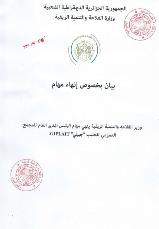 أنهى وزير الفلاحة والتنمية الريفية عبد الحفيظ هني، الأربعاء، مهام الرئيس المدير العام للمجمع العمومي للحليب “جيبلي”.