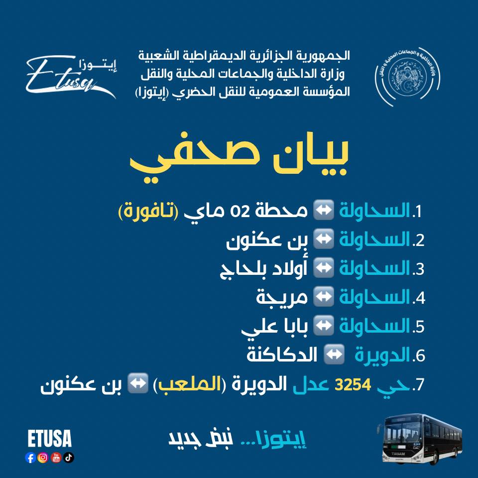 وأوضح بيان للمؤسسة، أنه تم تخصيص خمسة خطوط جديدة لبلدية السحاولة، تربطها بكل من محطة “02 ماي” (تافورة)، بن عكنون، أولاد بلحاج، مريجة وبابا علي، إلى جانب خطين اثنين لفائدة بلدية الدويرة، يربطانها بكل من دكاكنة وبن عكنون، انطلاقا من حي “3254 مسكن عدل” (الملعب).