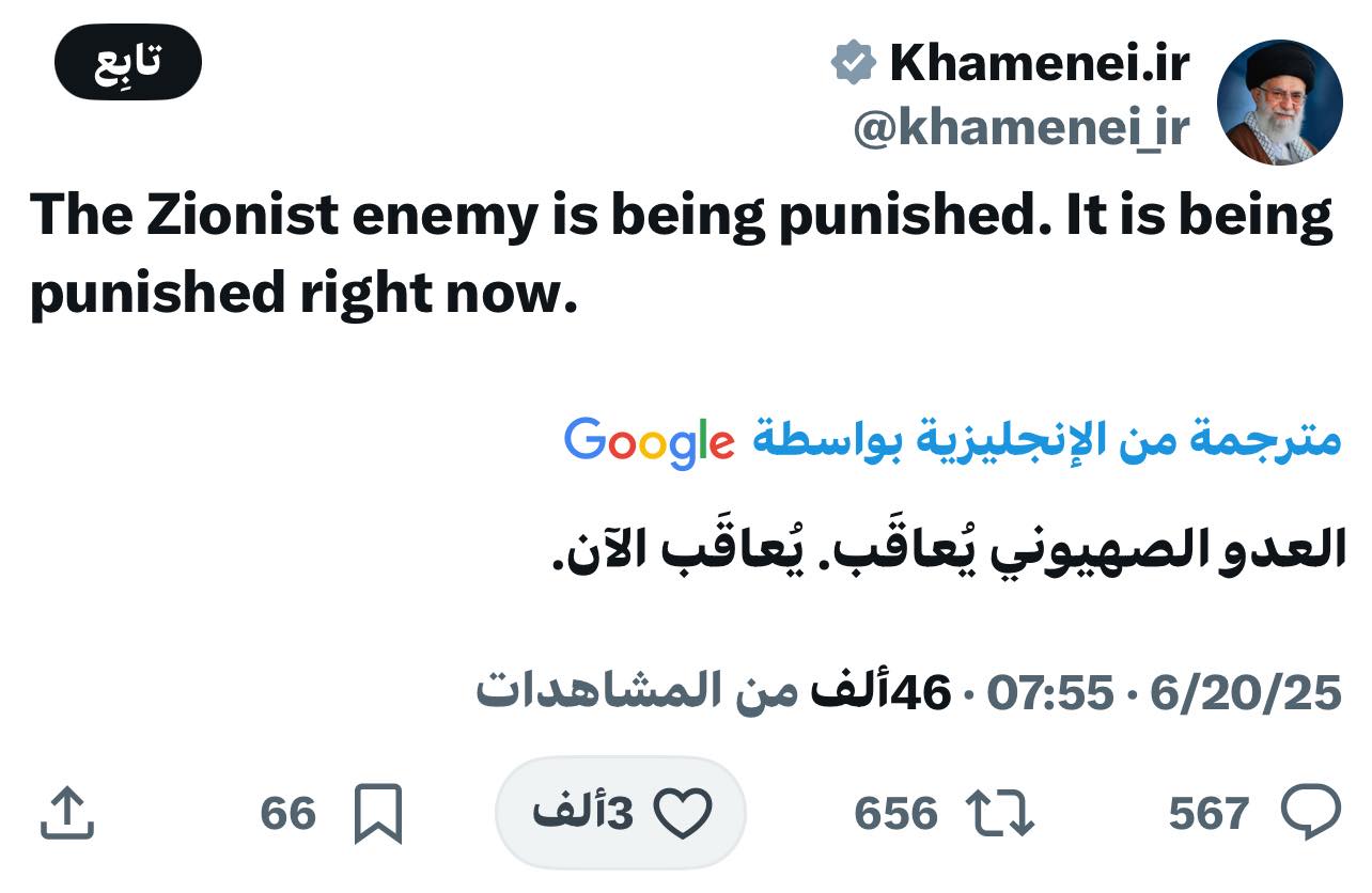 وتزامنا مع الهجوم علّق المرشد الإيراني علي خامنئي في تغريدة على حسابه في منصة “إكس”، قائلاً إن “العدو الصهيوني يعاقب في هذه اللحظة”.