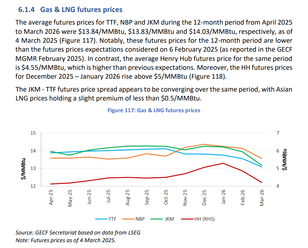 وبخصوص أسعار الغاز الطبيعي في السوق الآجلة، فقد بلغ متوسط الأسعار لـ TTF وNBP وJKM خلال الفترة الممتدّة من أفريل 2025 إلى مارس 2026، ما يعادل 13.84 دولارًا و13.83 دولارًا و14.03 دولارًا أمريكيًا لكل 01 مليون وحدة حرارية بريطانية، على التوالي، اعتبارًا من 4 مارس 2025 .