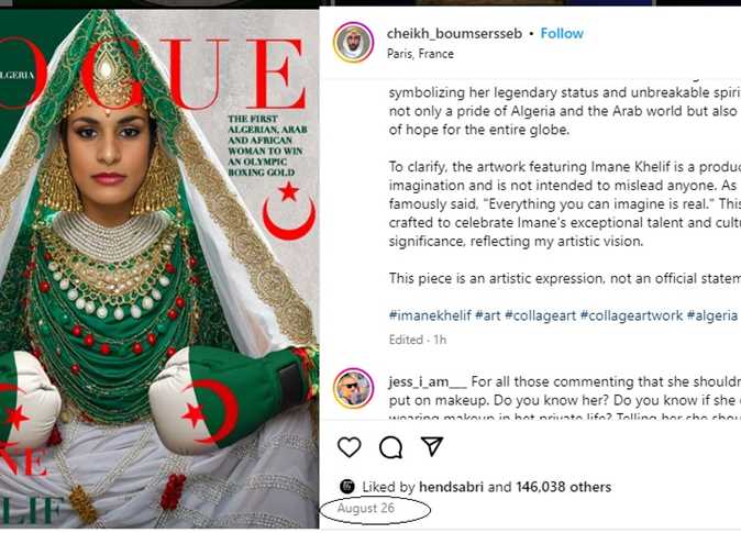 تظهر إيمان خليف في الصورة التي حظيت بتداول واسع بالشدة التلمسانية وهي لباس تقليدي جزائري، وفي يديها قفازات الملاكمة، أما التعليق المرافق فكان: “أول امرأة جزائرية عربية أفريقية تفوز في الألعاب الأولمبية بميدالية ذهبية”.
