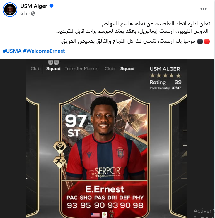 أعلن فريق اتحاد العاصمة تعاقده مع المهاجم الليبيري إرنست إيمانويل.
