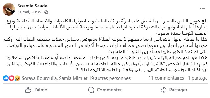 وتعرّضت المرأة لظلم كبير بعدما تجمّع الناس حولها واتهموها بحمل طلاسم، كما تم تصويرها وهي تحاول تغطية وجهها، وبتدخل أمن الولاية تبين أنها لم تقترف أي سوء وأن ما حصل مجرد هوس مبالغ فيه، جراء ما تطالعنا به حملات تنظيف المقابر من صور كارثية.
