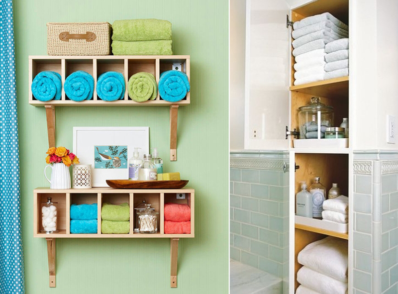 غرفة الاستحمام في بيت توجد به سيدات، هي معرض صغير لمختلف علب وقارورات مستحضرات التجميل والعناية بالشعر والبشرة، والكثير من عبوات الغسول والزيوت، لذلك لابد من الاستعانة بالرفوف التي تسهل عليك تنظيم أغراضك المحببة هذه، إذ تقول الكثير من السيدات، أن مجرد دخول غرفة الاستحمام والالتفات إلى انواع واشكال والوان عبوات المستحضرات المرصوصة جنب بعضها، يشعرها بمعنويات مرتفعة. في الحمام أيضا يمكنك وضع رف للتخلص من رؤية قارورات التنظيف مبعثرة هنا وهناك، فالرفوف ومهما كان شكلها تساعدك على ترتيب مواد التنظيف التي تستعملينها يوميا، وتساعد على جعلها بعيدة عن متناول الأطفال وما في ذلك من خطر، كما أنها في مظهرها معا تعطي انطباعا عن مدى نظام سيدة المنزل وحرصها على النظافة.