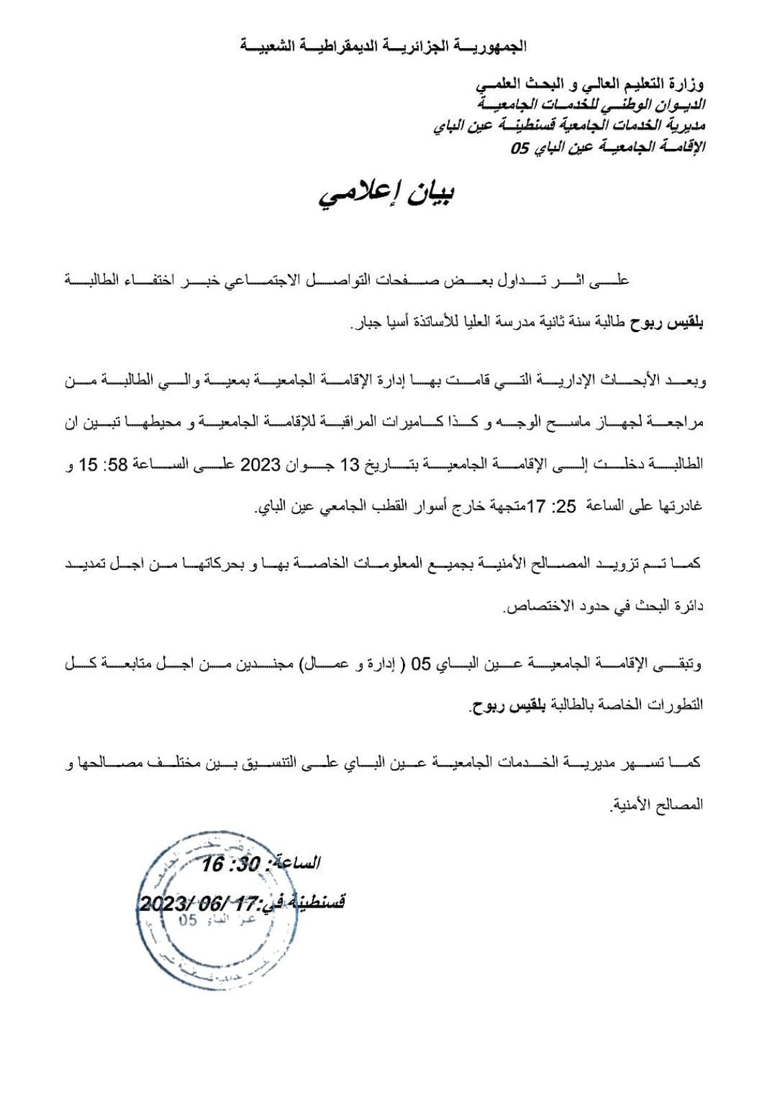 وبتاريخ 17 جوان الماضي أفادت إدارة الإقامة الجامعية “عين الباي 5” في بيان لها أنه  على اثر تداول بعض صفحات التواصل الاجتماعي خبر اختفاء الطالبة بلقيس ربوح طالبة سنة ثانية مدرسة العليا للأساتذة آسيا جبار وبعد الأبحاث الإدارية التي قامت بها إدارة الإقامة الجامعية بمعية والي الطالبة من مراجعة لجهاز ماسح الوجه وكذا كاميرات المراقبة للإقامة الجامعية ومحيطها تبين أن الطالبة دخلت إلى الإقامة الجامعية بتاريخ 13 جوان 2023 على الساعة 58: 15 وغادرتها على الساعة 25: 17 متجهة خارج أسوار القطب الجامعي عين الباي.