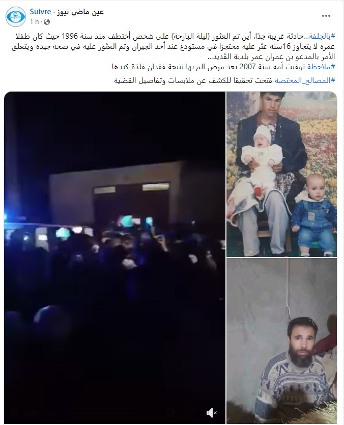 وبحسب ما أوردت صفحات ولاية الجلفة فإن الشاب بن عمران عمر الذي عثر عليه، ليلة أمس، في حفرة تحت الأرض مغطاة بالتبن في منزل جاره الواقع ببلدية الڨديد، تم خطفه عام 1996 وكان حينها يبلغ من العمر 16 عاما.