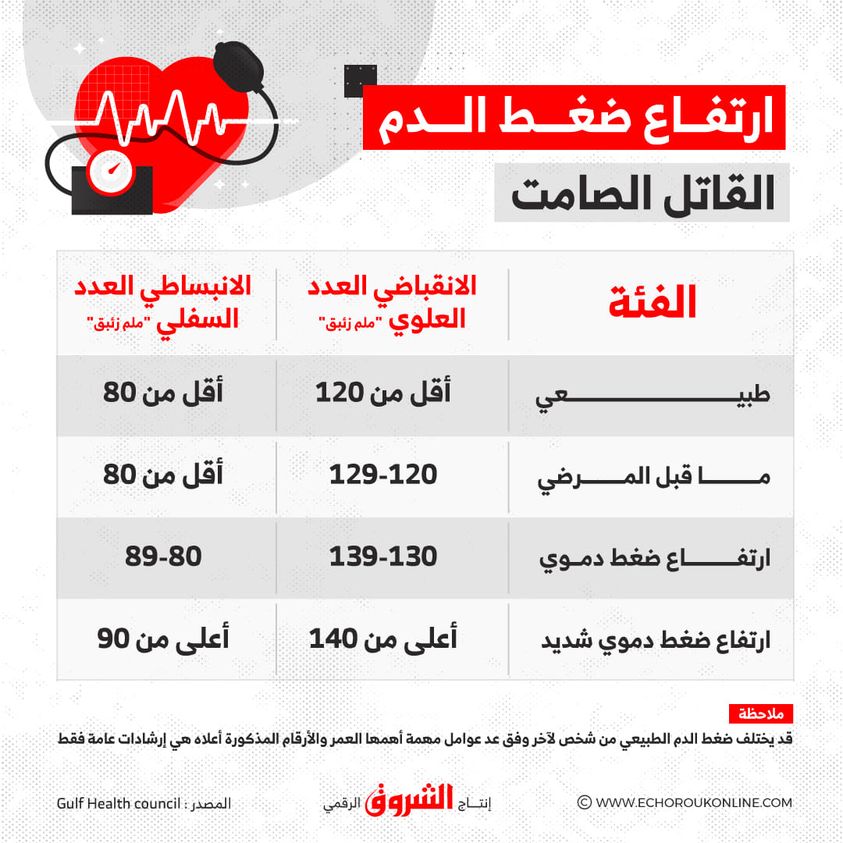 في هذا الإنفوجراف نستعرض معدلات ضغط الدم والحالة التي توافق كلا منها: