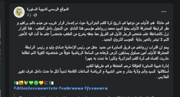 كما ندّدت أسرة شبيبة الساورة بِقرار منع الرئيس السابق للنادي محمد زرواطي، من الدخول إلى ملعب “20 أوت 1955” بِبشار، لمُتابعة أطوار مباراة فريقه والضيف اتحاد خنشلة.