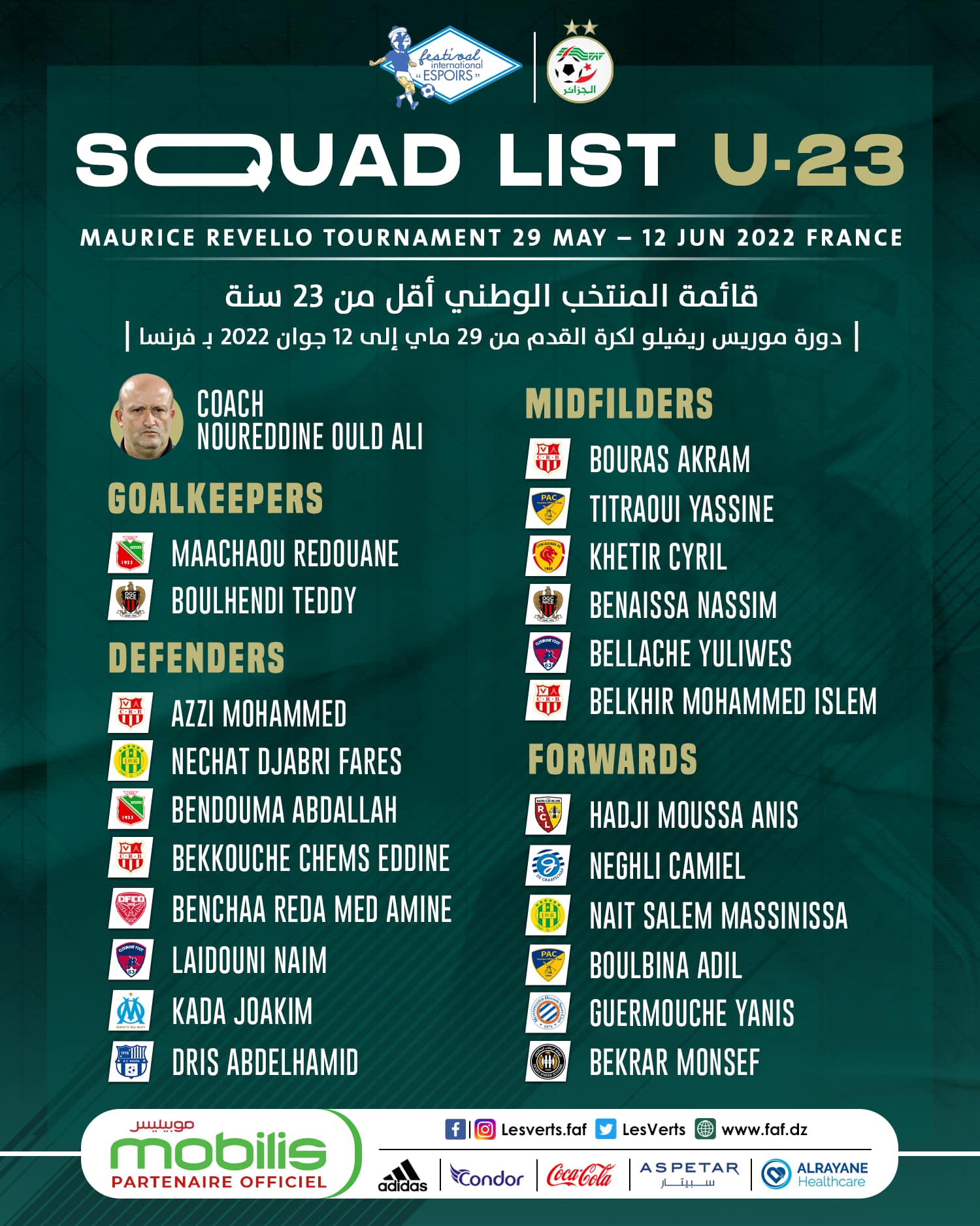 وتُجرى دورة “موريس ريفيلو” بِفرنسا، في فترة ما بين الـ 29 من ماي الحالي والـ 12 من جوان المقبل. حيث يلعب المنتخب الوطني لِأقلّ من 23 سنة في فوج يضمّ فرق كولومبيا واليابان وجزر القمر.