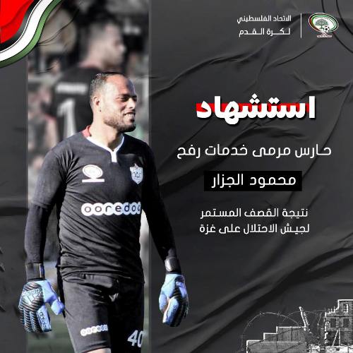 اسْتُشهد حارس المرمى الفلسطيني محمود أسامة الجزار حامي عرين النادي المحلي رفح، بعد قصف همجي لِمنزله من قبل المحتلّ الصّهيوني.