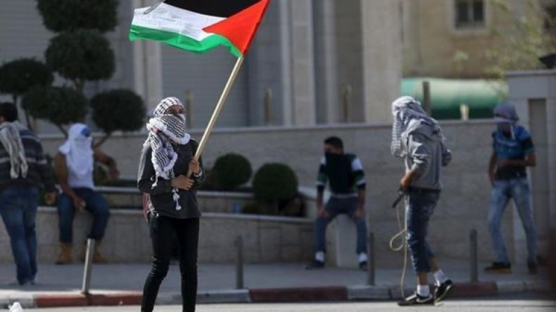 فتاة فلسطينية تحمل علم فلسطين خلال مواجهات مع الاحتلال قرب مستوطنة بيت ايل - 8 أكتوبر 2015
