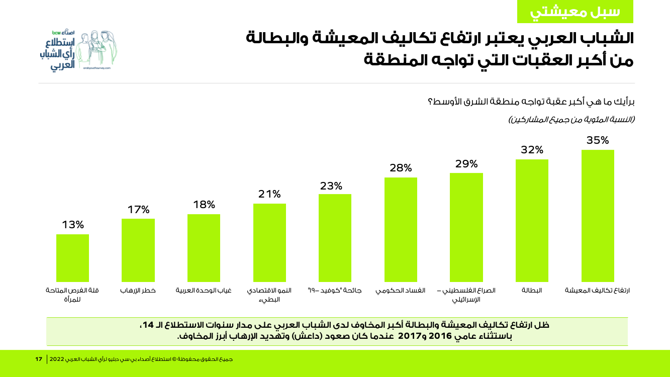 كما كشف استطلاع أن الشباب العربي يعتبر ارتفاع تكاليف المعيشة والبطالة من أكبر العقبات التي تواجه المنطقة.