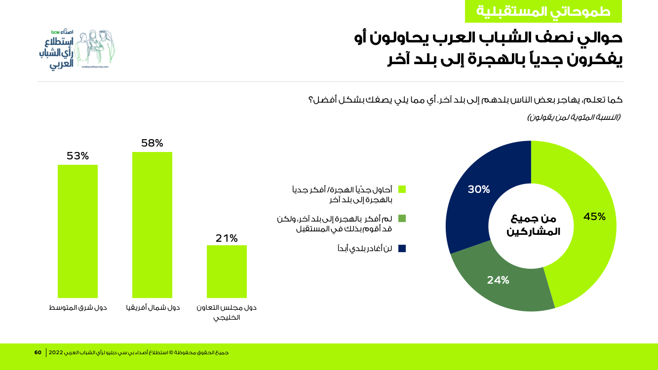 كما أعطى الشباب الأولوية لإنهاء تعليمهم وإيجاد فرص عمل، لكنّ فكرة الهجرة تصدرت اهتمام أكثر من نصفهم في دول شمال إفريقيا وشرق المتوسط، وكانت كندا وألمانيا الولايات المتحدة الوجهات الأكثر شعبية في صفوفهم.