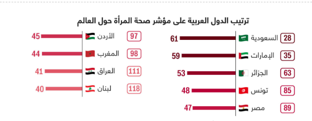 احتلت المرأة الجزائرية المرتبة الثالثة عربيا في مؤشر الصحة العالمي، بعد السعودية والإماراتية، وفق آخر استطلاع للرأي.