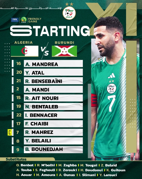 وأمضى رباعية “الخضر” كلّ من المهاجمين: بغداد بونجاح في الدقيقة الأولى، والقائد رياض محرز في الدقيقة الـ 39، وإسلام سليماني في الدقيقة الـ 87، ومحمد الأمين عمّورة في الوقت بدل الضّائع (90+3).