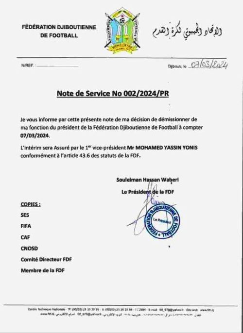 ولم يذكر اتحاد الكرة الجيبوتي سبب الإستقالة في بيان مُقتضب نشره، الخميس.