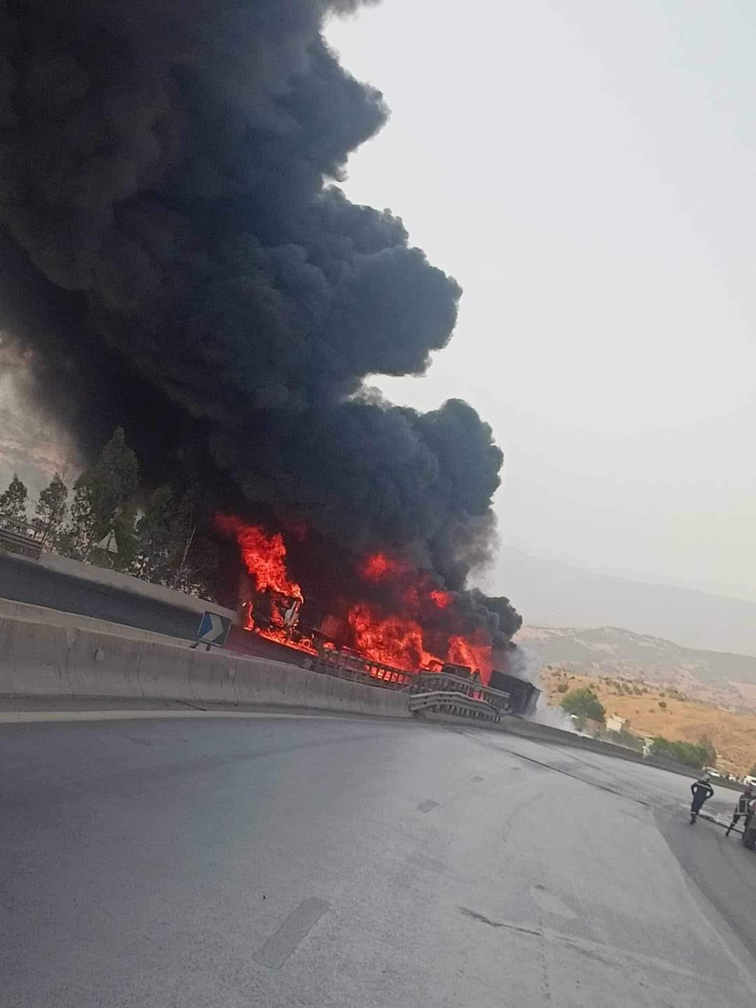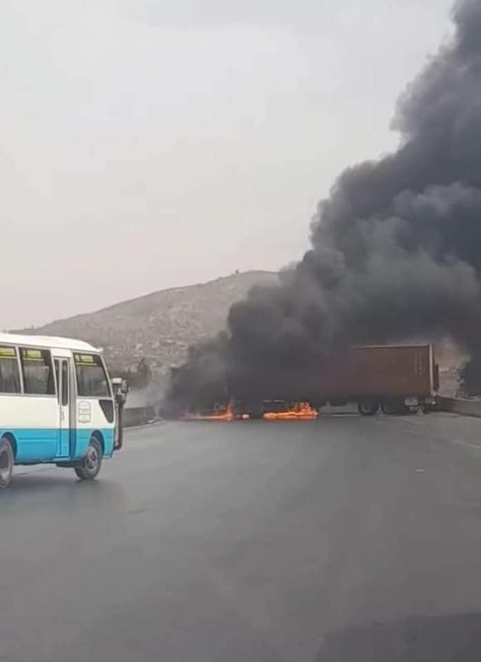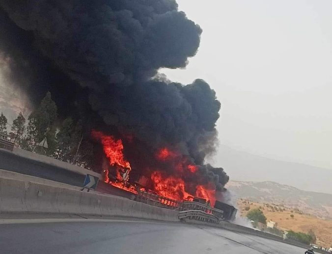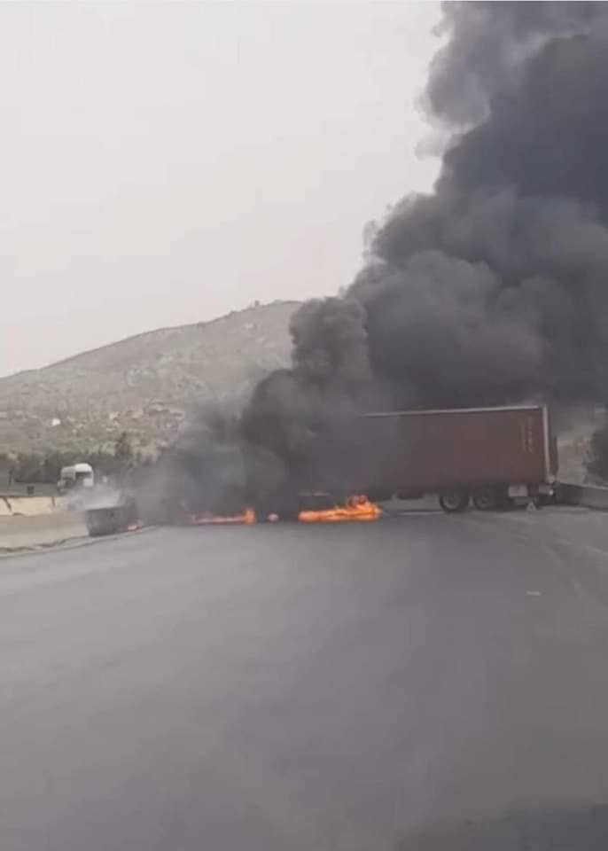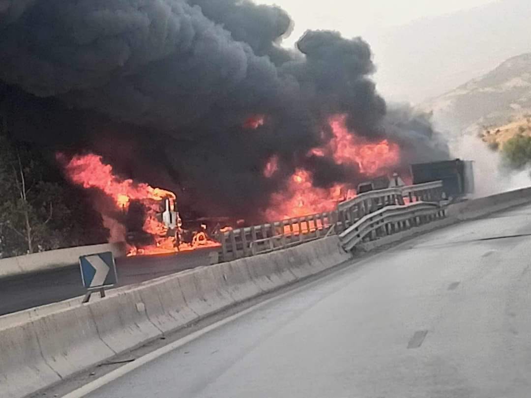 اشتعال 3 شاحنات بالطريق السيار شرق غرب في الجباحية (صور)