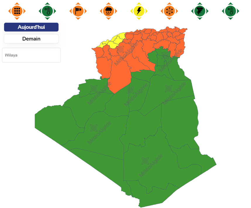 كما جاء في النشرية تنبيه من المستوى الأول يخص هبوب رياح قوية وتساقط أمطار عبر ولايات: المسيلة، الجلفة، الأغواط، البيض، تيارت، تيسمسيلت، الشلف، غليزان، مستغانم، معسكر، سعيدة، سيدي بلعباس، تلمسان، عين تيموشنت ووهران.