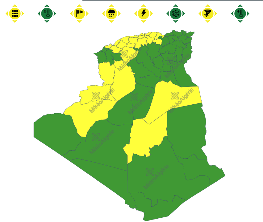 كما حملت النشرية تنبيها اخر حول تساقط أمطار رعدية غزيرة عبر ولايات: جيجل، سكيكدة، عنابة، الطارف، سوق أهراس، قالمة، قسنطينة، ميلة، سطيف، باتنة، أم البواقي، خنشلة وتبسة.