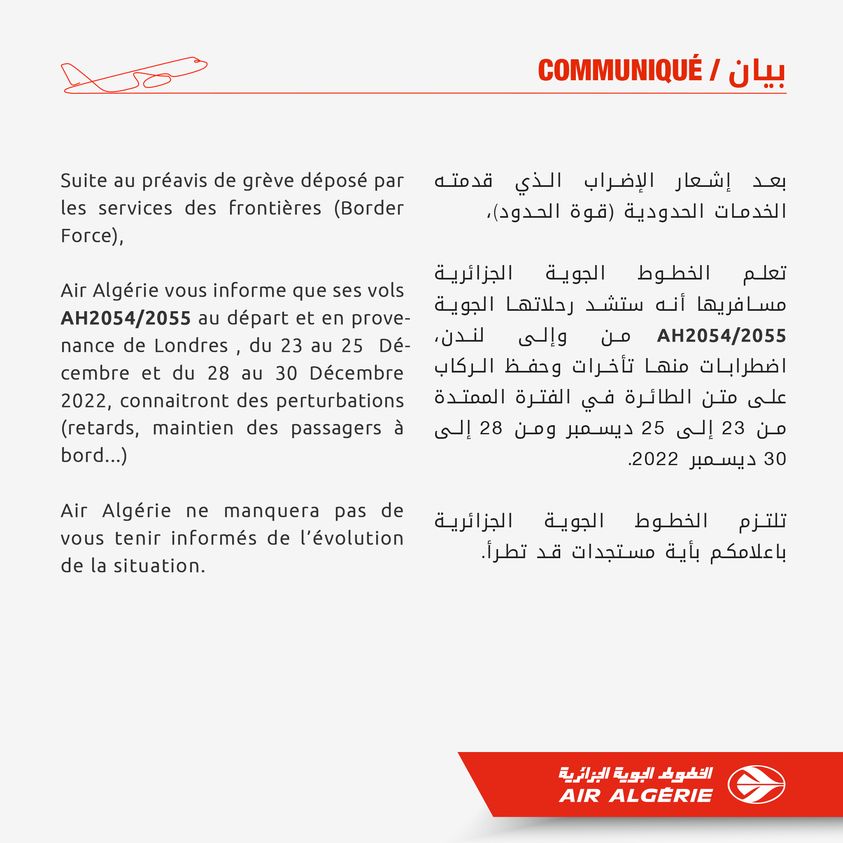 أبلغت الجوية الجزائرية مساء الخميس في بيان، عن تسجيل اضطرابات في مواعيد رحلاتها من وإلى العاصمة البريطانية لندن. بسبب إضراب عمال الخدمات الحدودية هناك.