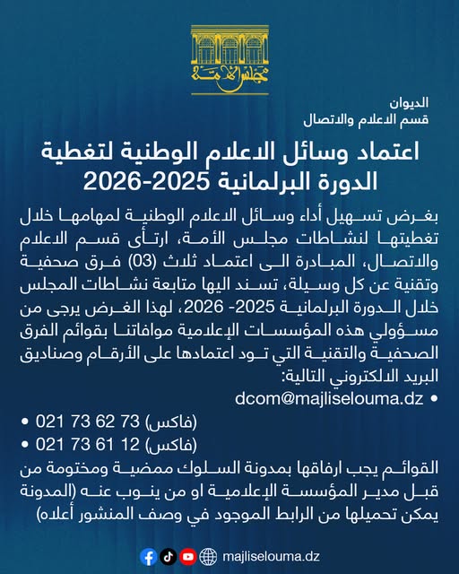 أعلن مجلس الأمة، الأحد، عن إجراءات جديدة لتسهيل مهام وسائل الإعلام الوطنية خلال تغطيتها لنشاطات الدورة البرلمانية 2025-2026، حيث بادر قسم الإعلام والاتصال إلى اعتماد ثلاث فرق صحفية وتقنية عن كل وسيلة إعلامية تُكلف بمتابعة أشغال المجلس.