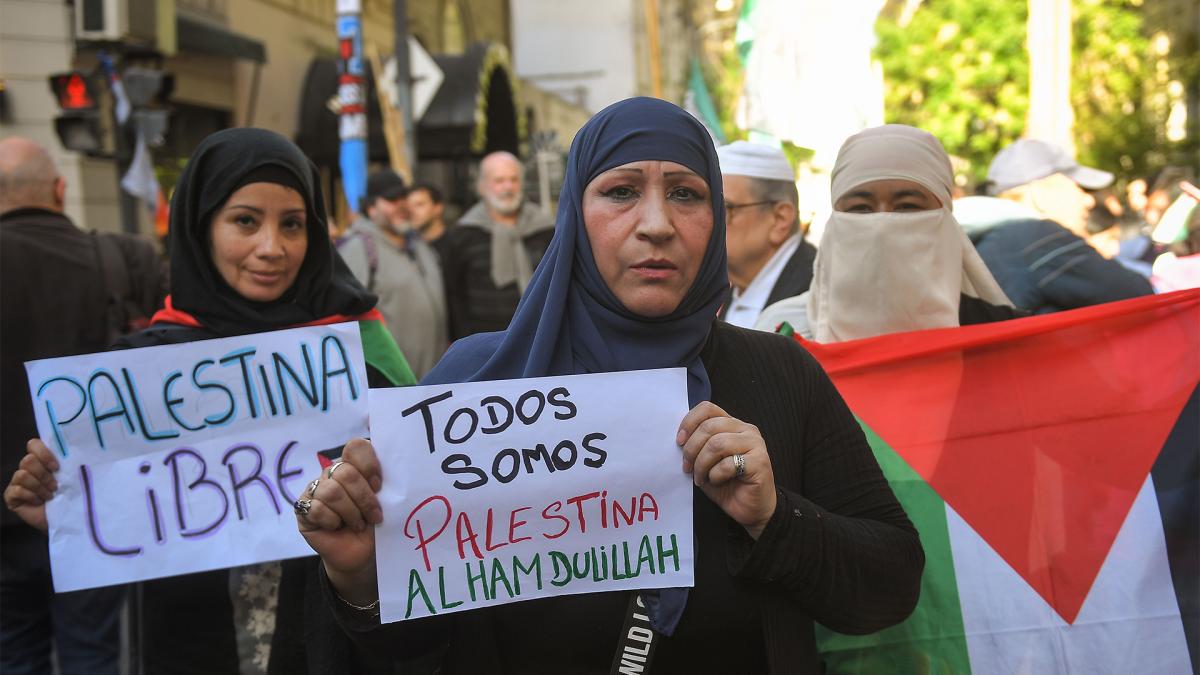 مظاهرة أمام السفارة الفلسطينية في الأرجنتين لدعم الشعب الفلسطيني، يوم الخميس 19 أكتوبر 2023. صورة : فيكتور كاريراس/تيلام
