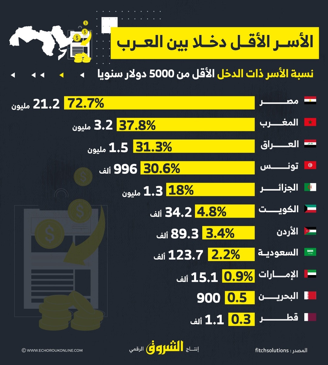 الأسر الأقل دخلا بين الدول العربية (مداخيل أقل من 5000 دولار سنويا)