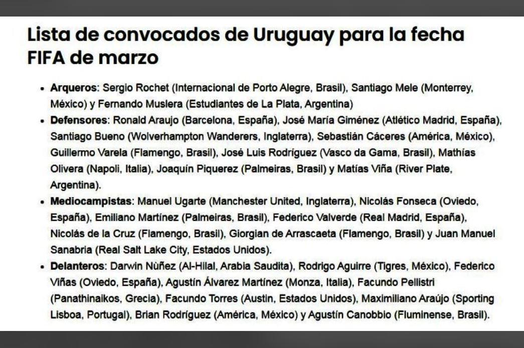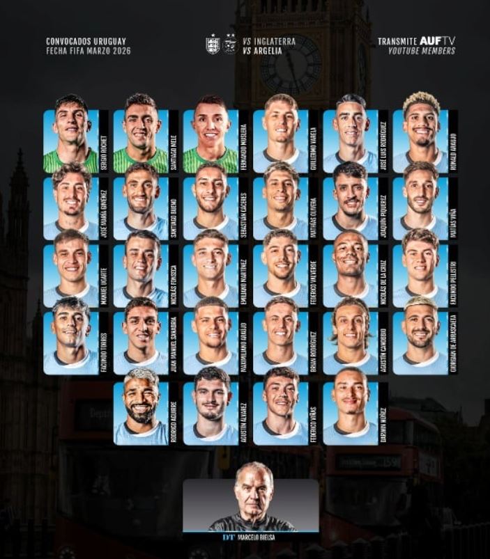 ولا يوجد في اللائحة أي لاعب ينشط في البطولة المحلّية، عِلما أن التقني الأرجنتيني مارسيلو بييلسا (70 سنة) يُدرّب منتخب الأوروغواي منذ ماي 2023.