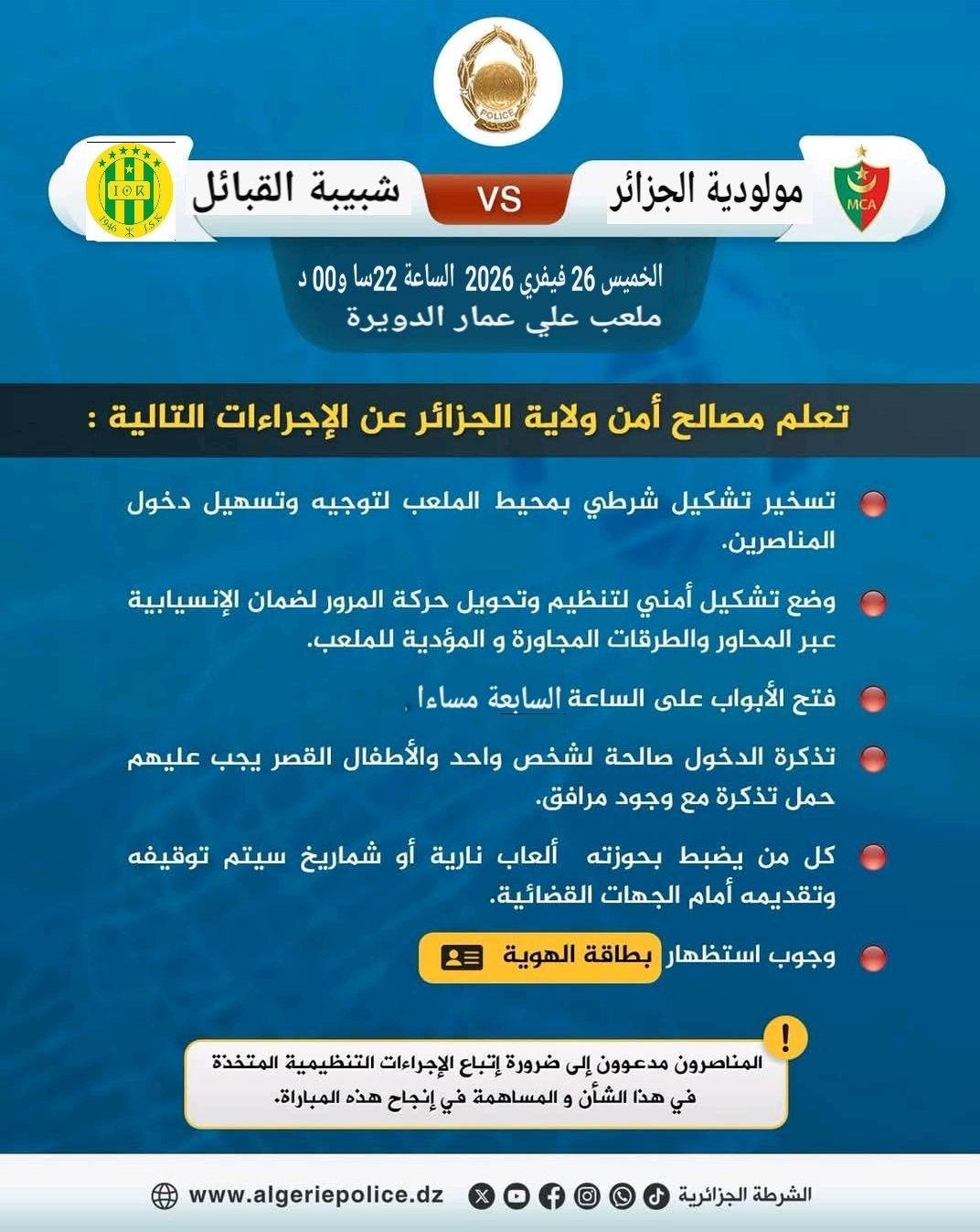 أعلنت شرطة الجزائر العاصمة عن جملة من التدابير والإجراءات لتأمين مباراة مولودية الجزائر وشبيبة القبائل.