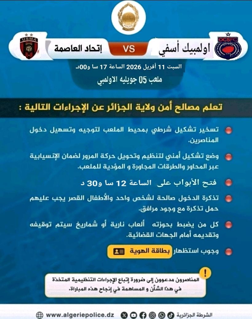 أعلنت شرطة الجزائر العاصمة عن جملة من التدابير والإجراءات المتخذة، لتأمين مباراة اتحاد العاصمة وأولمبيك آسفي المغربي.