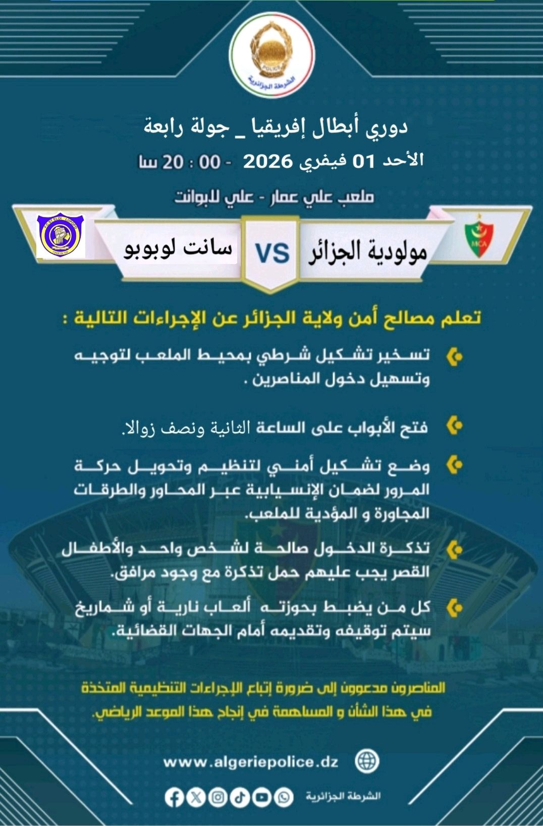أعلنت مصالح أمن ولاية الجزائر عن جملة من الإجراءات والتدابير التنظيمية لتأمين لقاء مولودية الجزائر وضيفه لوبوبو الكونغولي.
