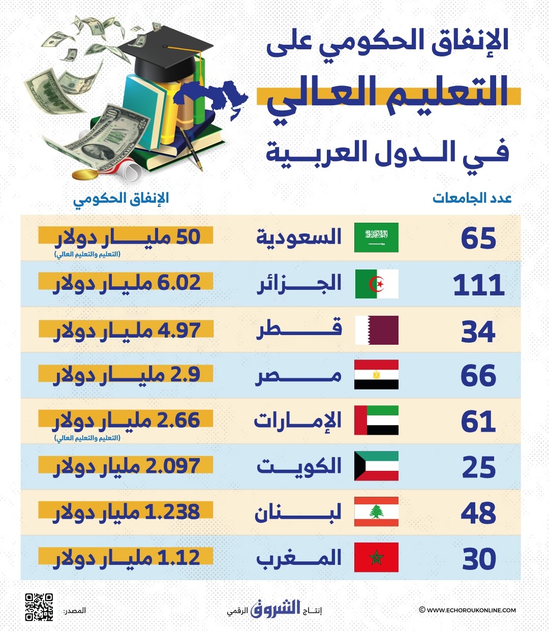عدد الجامعات وحجم الإنفاق الحكومي على قطاع التعليم العالي في الدول العربية لعام 2023..