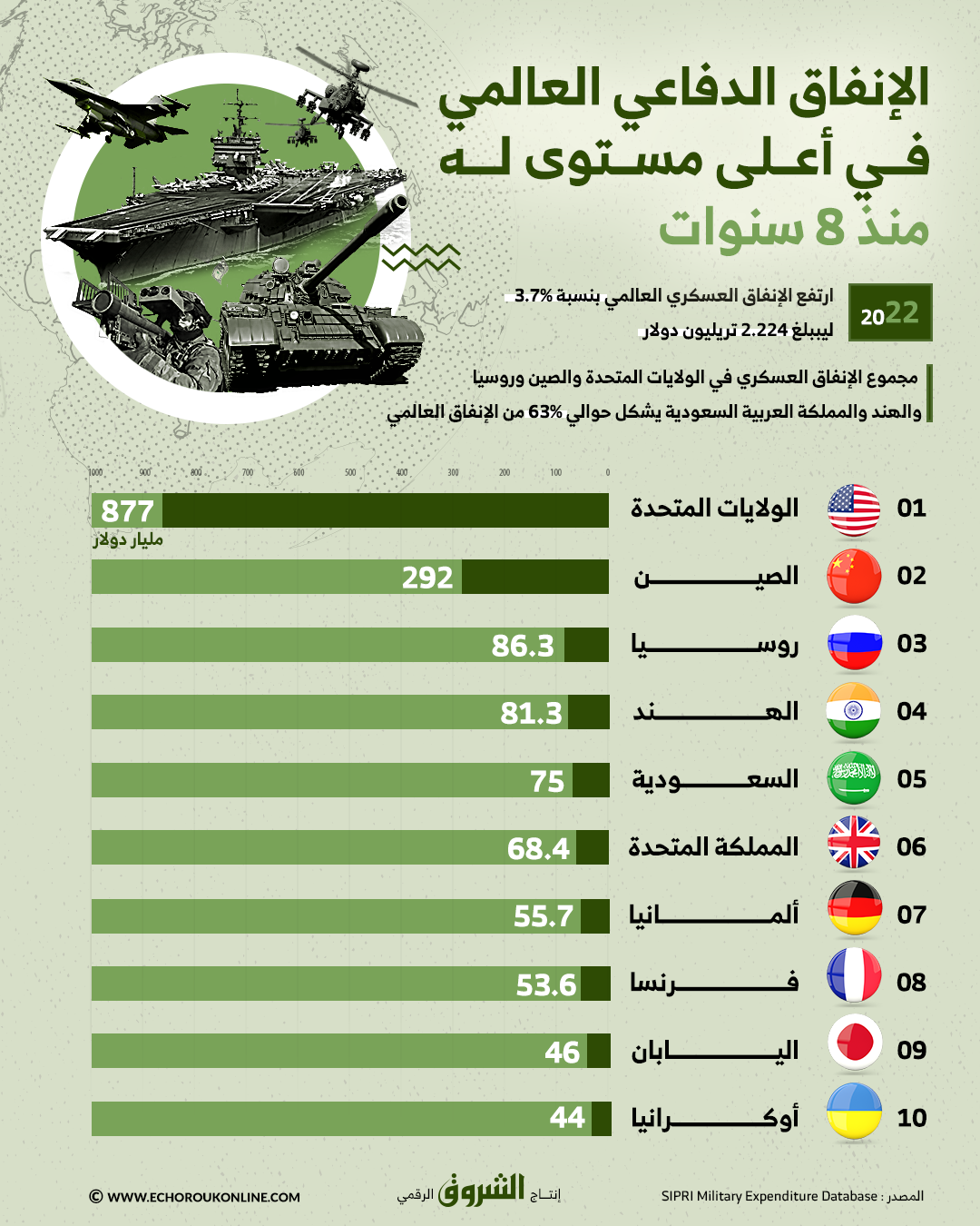 2022 شهدت ارتفاع الإنفاق الدفاعي العالمي بنسبة 3.7 بالمائة ليصل لأعلى مستوياته منذ 8 سنوات..