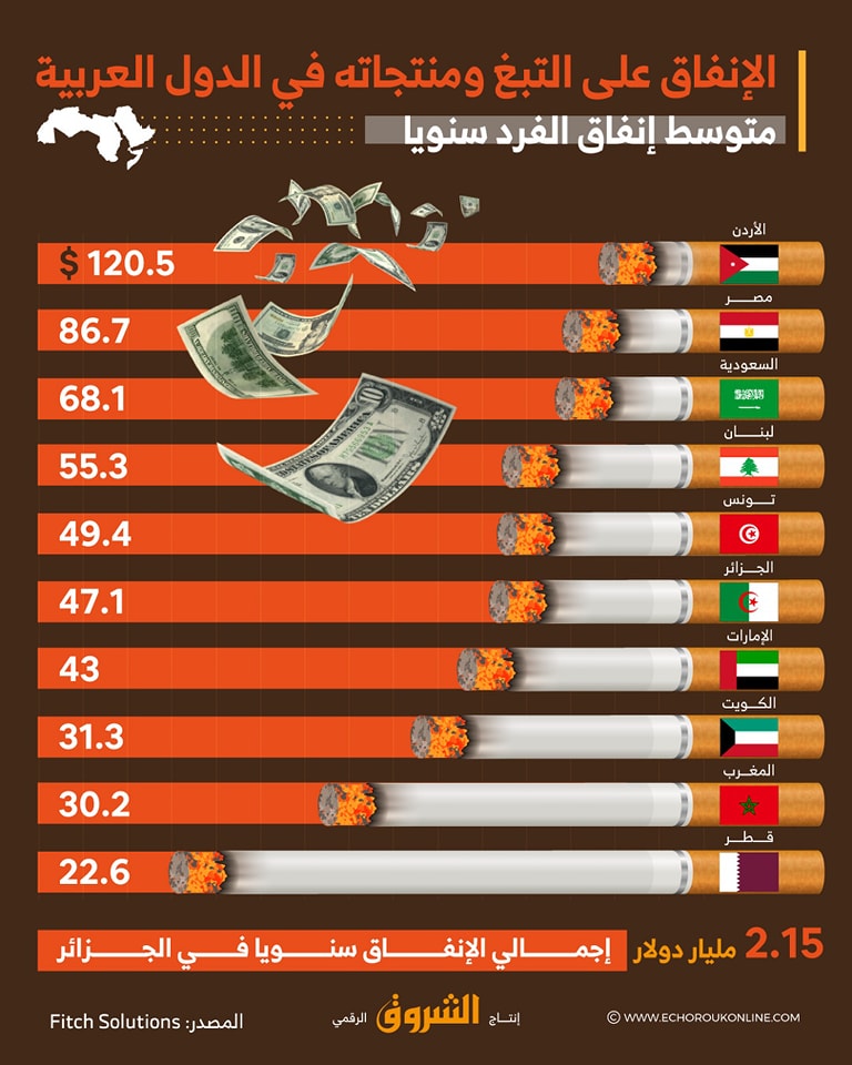 هذا هو متوسط إنفاق الفرد سنويا على التبغ ومنتجاته في الدول العربية