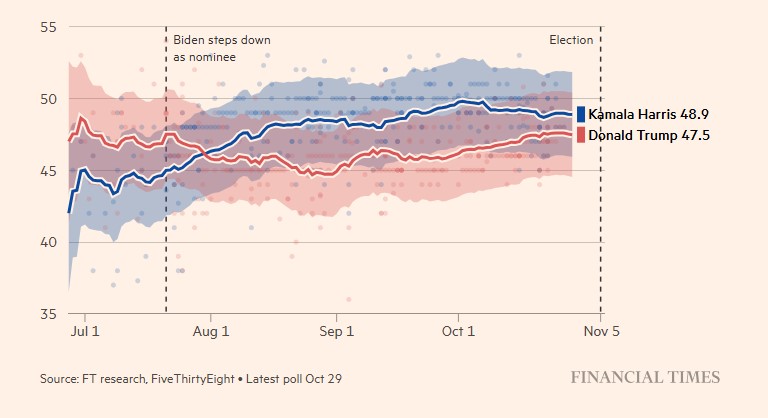وبحسب صحيفة الـ FINANCIAL TIMES، تشير استطلاعات الرأي إلى تقارب شديد بين المرشّحين ترامب وهاريس، مع تفوّق الأخيرة بفارق بسيط (%1.4).