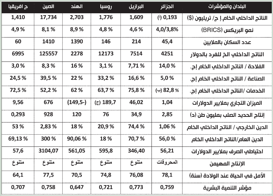 سنرتكز على مؤشرات اقتصادية واجتماعية للأعضاء الحاليين لمجوعة ”البريكس” (BRICS) لعلنا نهتدي، إلى مقامات مشتركة تكون قد عملت لصالح إنشاء هذه المجموعة. وسنستعين بنفس المؤشرات ومن غيرها من المؤشرات المكملة لنحدد موقعنا من تصريح أعلى السلطات العمومية في البلاد بخصوص انضمام الجزائر إلى هذه المجموعة. ويتعلق الأمر بمؤشرات الناتج الداخلي الخام الإجمالي، والناتج الداخلي الخام للفرد الواحد، ونسبة الفلاحة والصناعة والخدمات في الناتج الداخلي الخام الإجمالي، ومؤشر النمو الاقتصادي، ووضعية الميزان التجاري أو فوائض الصادرات، وإنتاج الحديد الصلب، ونسبة الديون الخارجية والدين العام (أو الداخلي) إلى الناتج الداخلي الخام الإجمالي، واحتياطي الصرف، والتنويع الاقتصادي، والأمل في الحياة عند الولادة، ومؤشر التنمية البشرية.