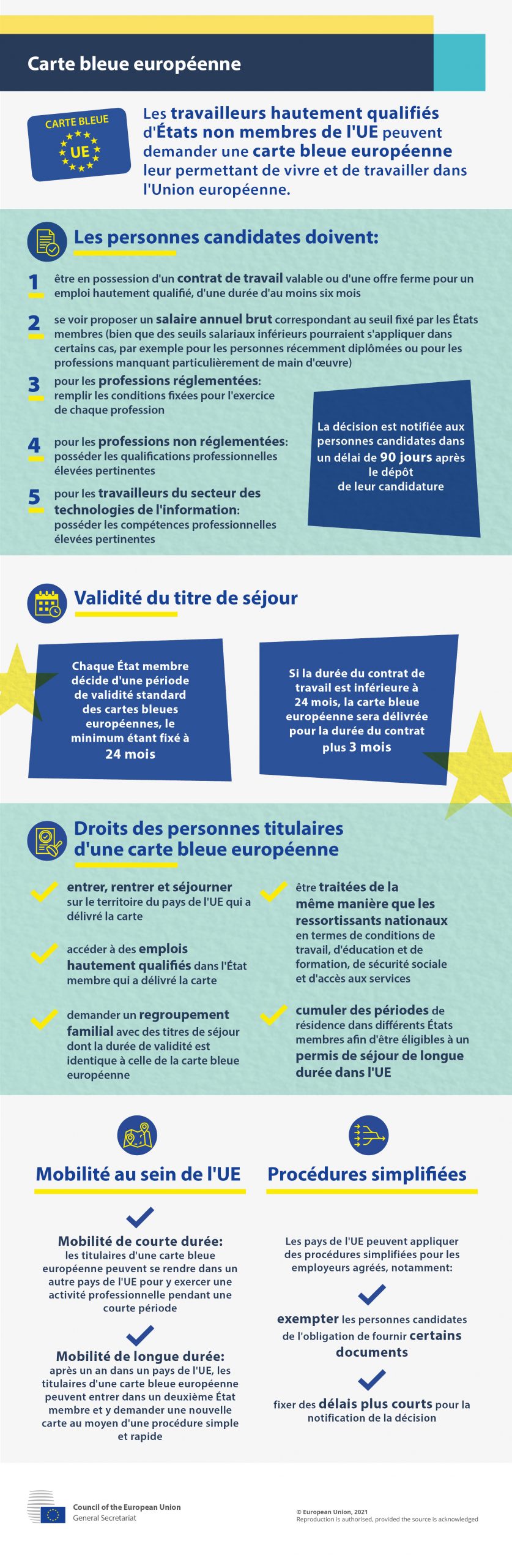 وتحدد اللوائح التوجيهية الخاصة بـ “البطاقة الزرقاء” والتي أضيفت إليها تعديلات مكمّلة لتلك التي اعتمدت في 2009، شروط الدخول والإقامة التي يجب أن يفي بها رعايا الدول وأفراد أسرهم من أجل الحصول على وظائف عالية الكفاءة في الدول الأعضاء في الاتحاد الأوروبي.