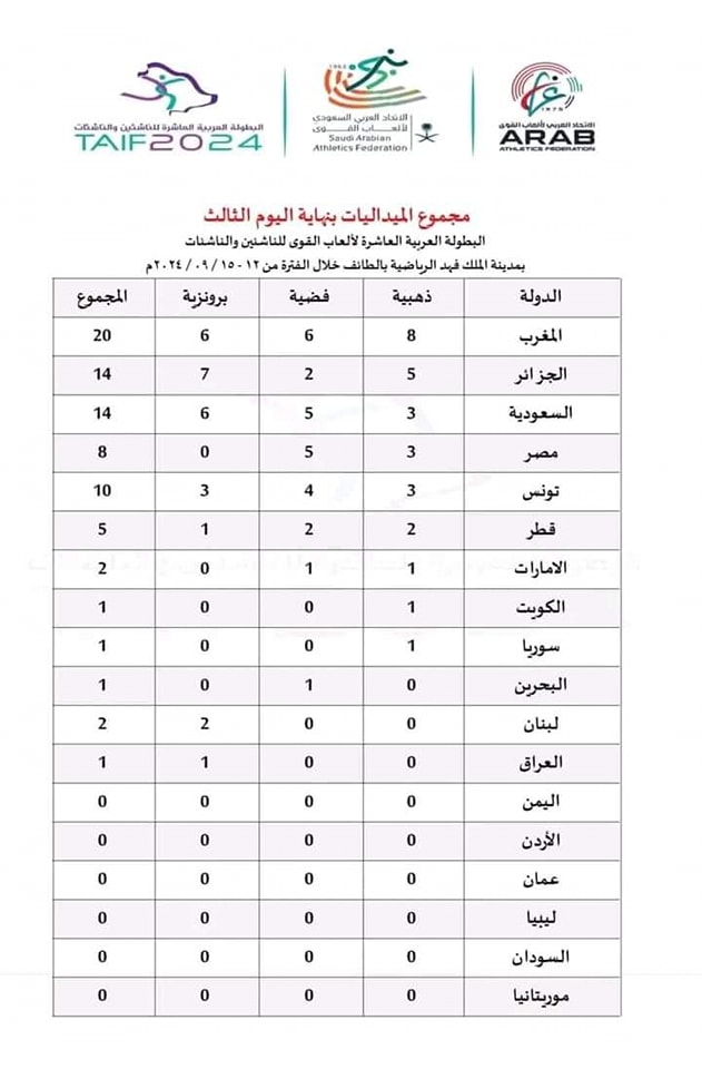 رفعت الجزائر رصيدها إلى 14 ميدالية، قبل منافسات اليوم الأخير من البطولة العربية للناشئين والناشئات التي تختتم الأحد بالسعودية.